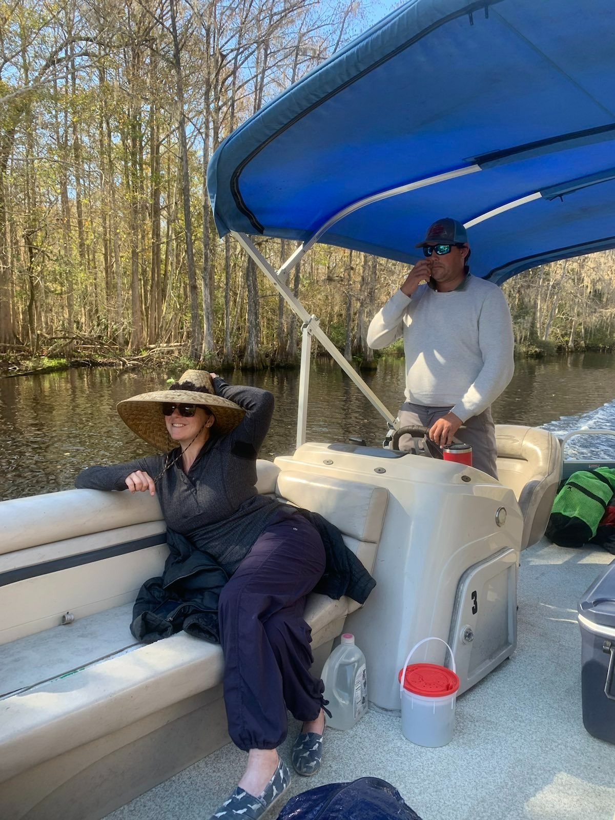 Our next river adventure was the following day when Gus rented a pontoon boat for us for an afternoon trip on the Rainbow River. After he and Alex were done coaching at the horse show for the day we loaded up and headed to Captain Bob’s marina in Dunnellon. Carrying scuba and snorkel gear, we loaded up the boat and headed upstream- first taking a detour into the blackwater Withlacoochee river to see if we could spot the notorious giant alligator. Sadly, he/she was hiding that day. We then backtracked back to the Rainbow River and it was wild how the two rivers converged- a clear delineation between the crystal clear water of the Rainbow and the black water of the Withlacoochee.