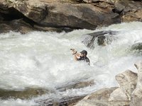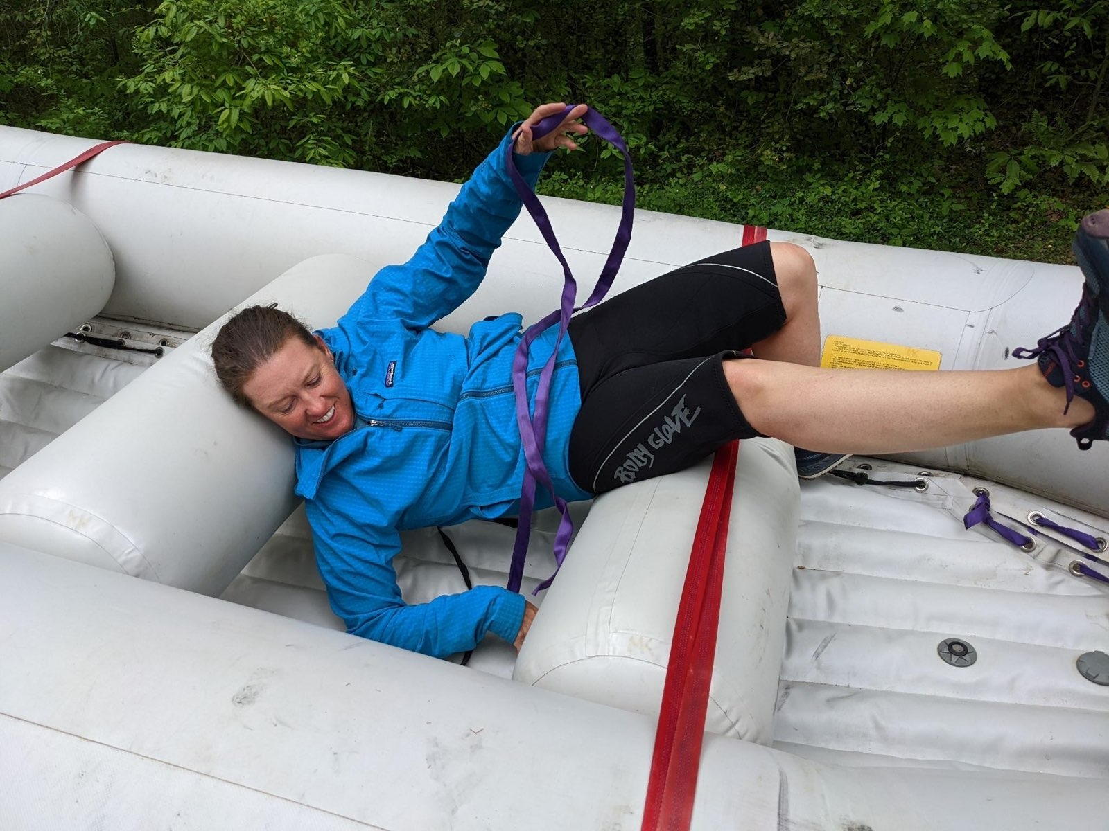 At the base of the rapid, once the adrenaline rush had subsided, we discovered that the raft had popped its laces in several spots. The lacing connects the floor of the raft to the body and allows it to be self-baling. We were able to cobble together a repair out of some straps and carabiners that would work to get us down the remaining portion of the river. (Sunday morning before we took the raft out we had to restring several sections which proved to be rather awkward with the inflated craft!)