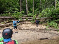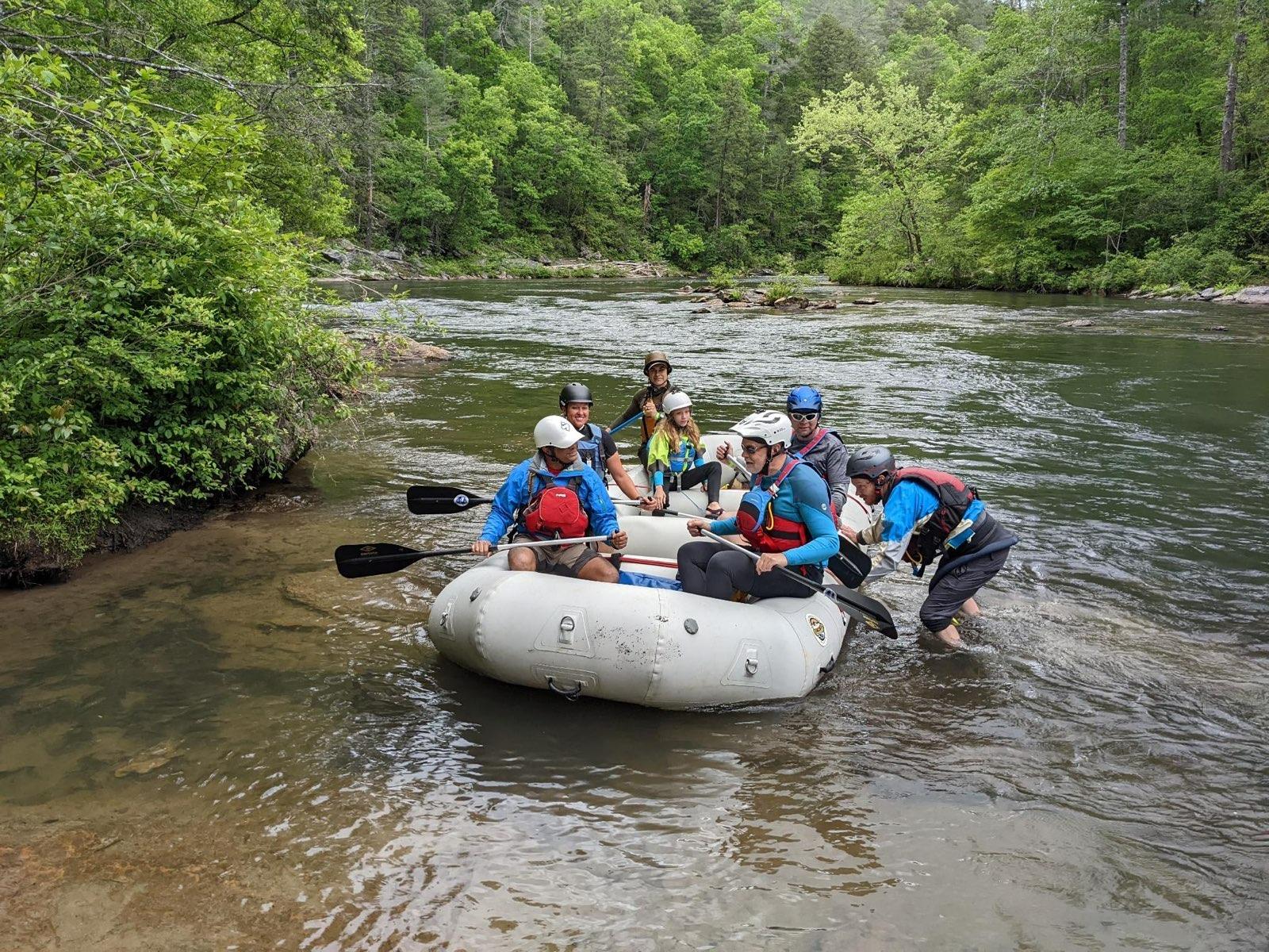 Our only mishap of the day happened at Woodall Shoals. This rapid is deceptively dangerous due to a large and strong hydraulic so its best to portage around it rather than run it. When we put the raft back into the river below the hole we didn’t paddle strongly enough to be successful in our ferry attempt and got pushed down into an impassable section of the rapid- too many boulders made it impossible to navigate. We had to fish the raft out of the river and back up to the base of Woodall and try again. This time we were successful and had a good run.
