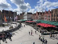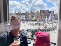 We were thirsty again after the canal tour so stopped into a local beer shop that had hundreds, if not thousands of different varieties and brands of bottled European beers. Imagine a highly concentrated Total Wine devoted entirely to beer from small breweries located in a small store inside a medieval building in a medieval town. They also had about ten beers on tap so we sat down to enjoy another one. Scott discovered earlier in our trip that he liked a Belgian beer called Delirium Red, a strong but fruity and slightly sour beer, and they had it on tap here. We sat out front of the store and watched the foot traffic, as well as the occasional car and horse drawn buggy traffic that tried to plow over the foot traffic, because evidently many people are in the same boat as Scott, and don’t take cobblestones as a road very seriously. After we finished our beers we walked around the town some more and popped into a grocery store where I bought more Delirium beer for both of us- heavy bottled beer, and we took turns carrying it for the next several hours.