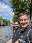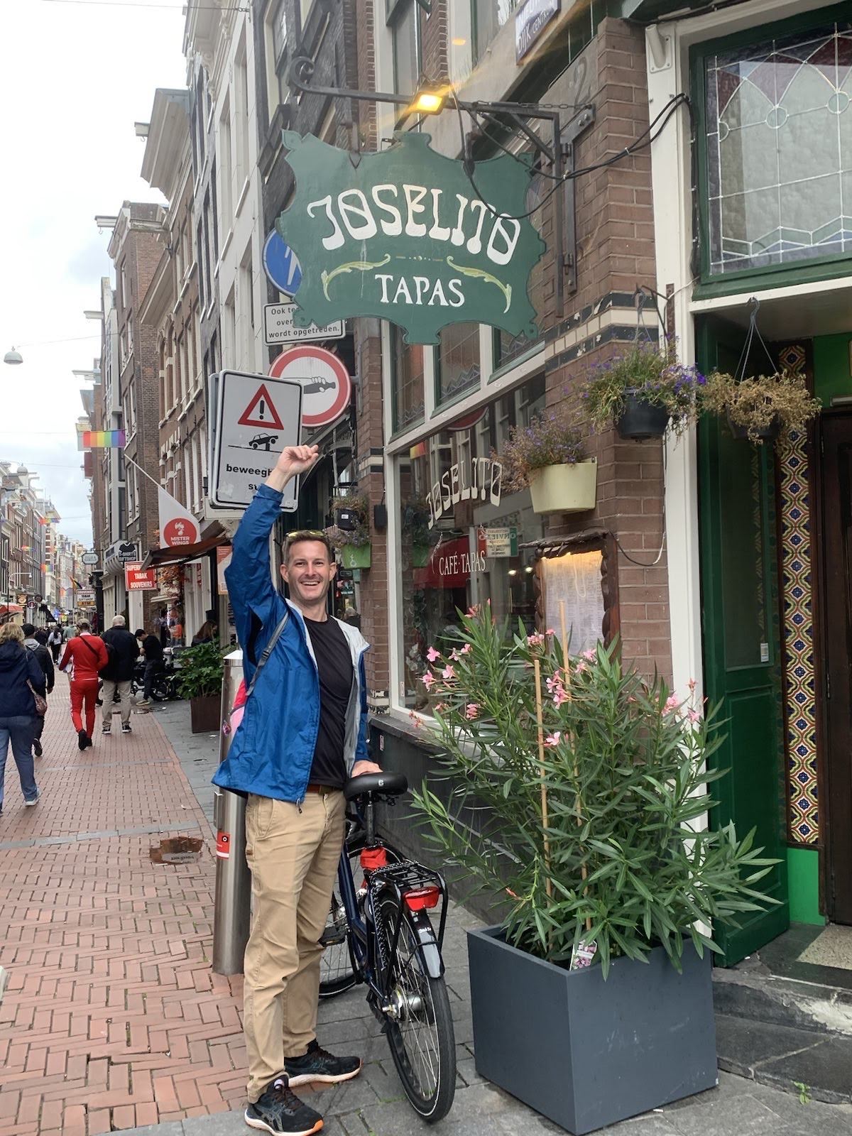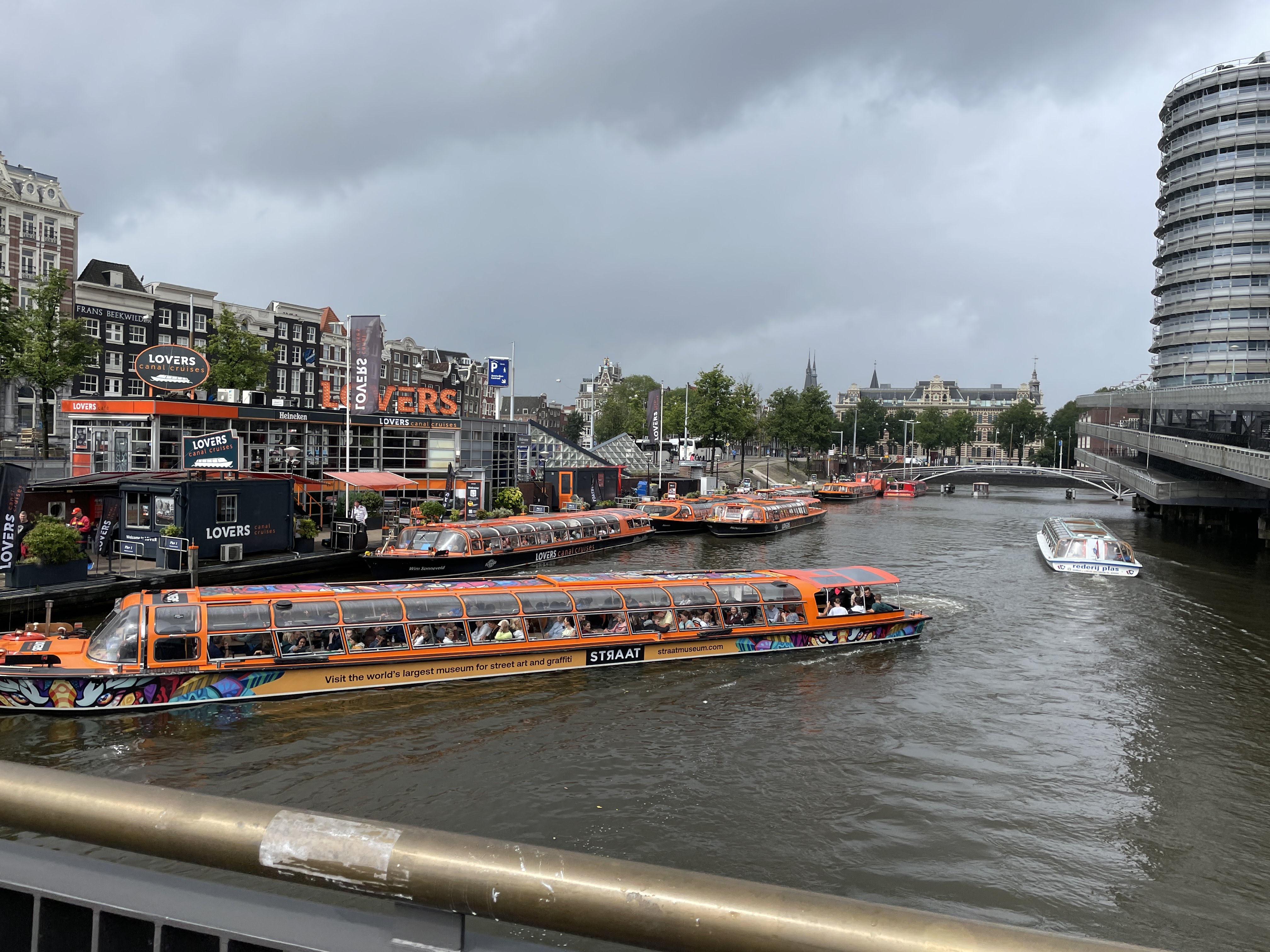 Having consumed the frites, we then wandered around the city. We explored many of the side streets and then made our way to the canals. We were amazed by the sheer amount of bicycles that we encountered- it seemed that the bike traffic may have outnumbered the foot traffic and you had to keep your head on a swivel to avoid veering into the path of speeding bikes hurtling at you. The episode of Ted Lasso that depicts a team trip to Amsterdam captures this chaos perfectly when Rebecca ends up in a canal dodging bikes! The bridges over each of the canals were decorated with flowers in pretty planters and were adorned with even more bicycles- those that were not currently being ridden around the city. We enjoyed seeing all of the different flavors and styles of houseboats docked along the canals and sat for a bit and watched the boat traffic inside the canals- its own little highway.