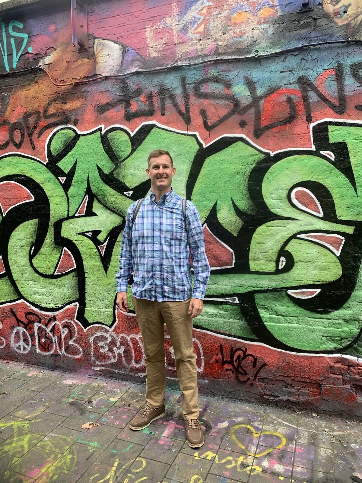 Our apartment looked directly down on an interesting Ghent feature: Graffiti Street, so that was our first stop. Graffiti Street is a short alleyway where graffiti is both allowed and encouraged and the only rule that applies is the “rule of the spray can” which evidently means you shouldn’t paint (paint? Or would it be draw? Maybe spray?) over works that are better than yours and don’t be noisy late at night and disrupt the local residents. It was a wild thing to see and we enjoyed seeing the creativity and talent of some of the artists. The paint that has accrued on the buildings in the alley since Graffitti Street was born in 1995 must have been close to an inch thick.