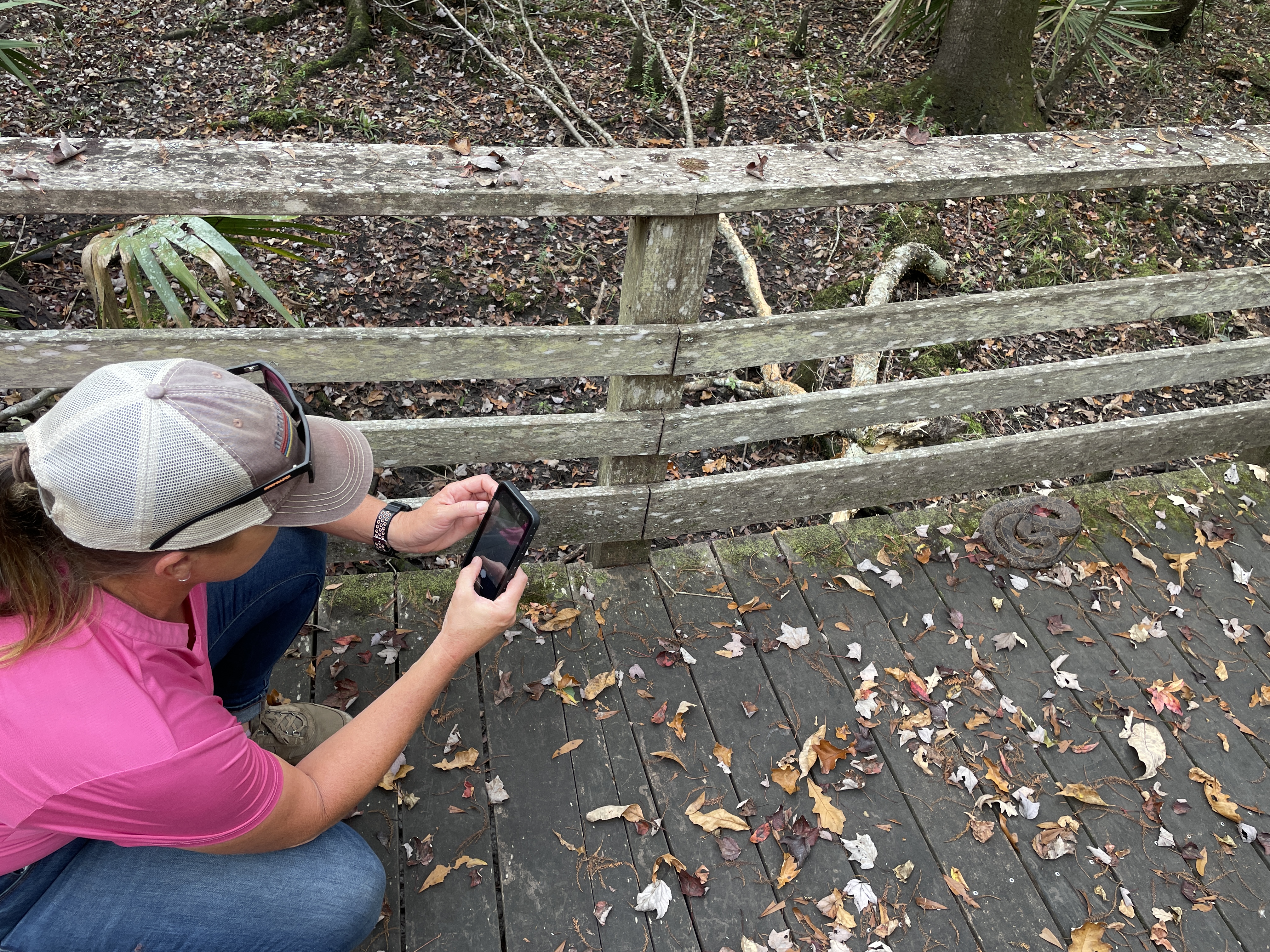 On our way back to the visitor’s center an employee appeared on the boardwalk about 50 yards in front of us and very calmly but firmly announced for us to stop because there was a water moccasin somewhere between us and him. We didn’t have to be told twice and stopped in our tracks, heads on a swivel. Snake stick in hand, the employee inched forward along the boardwalk in search of the snake. What he found (about 10 yards in front of us) was a nonvenomous, shy, and very common, brown water snake. A visitor that had passed by her previously had made the common mistake of misidentifying her. He invited us up to her and pointed out the features that often get them confused with water moccasins (a long mouth which enables them to grip onto fish gives them more of a triangular head which people mistake for a venomous snake as well as their shorter and wider body). She seemed nonplussed by our impromptu nature class and lay politely coiled so we could learn about her. The employee decided she was fine where she was and didn’t need to be shooed off the boardwalk since the center was about to close for the day. We headed back to the car and plugged in Becky’s address into the GPS.