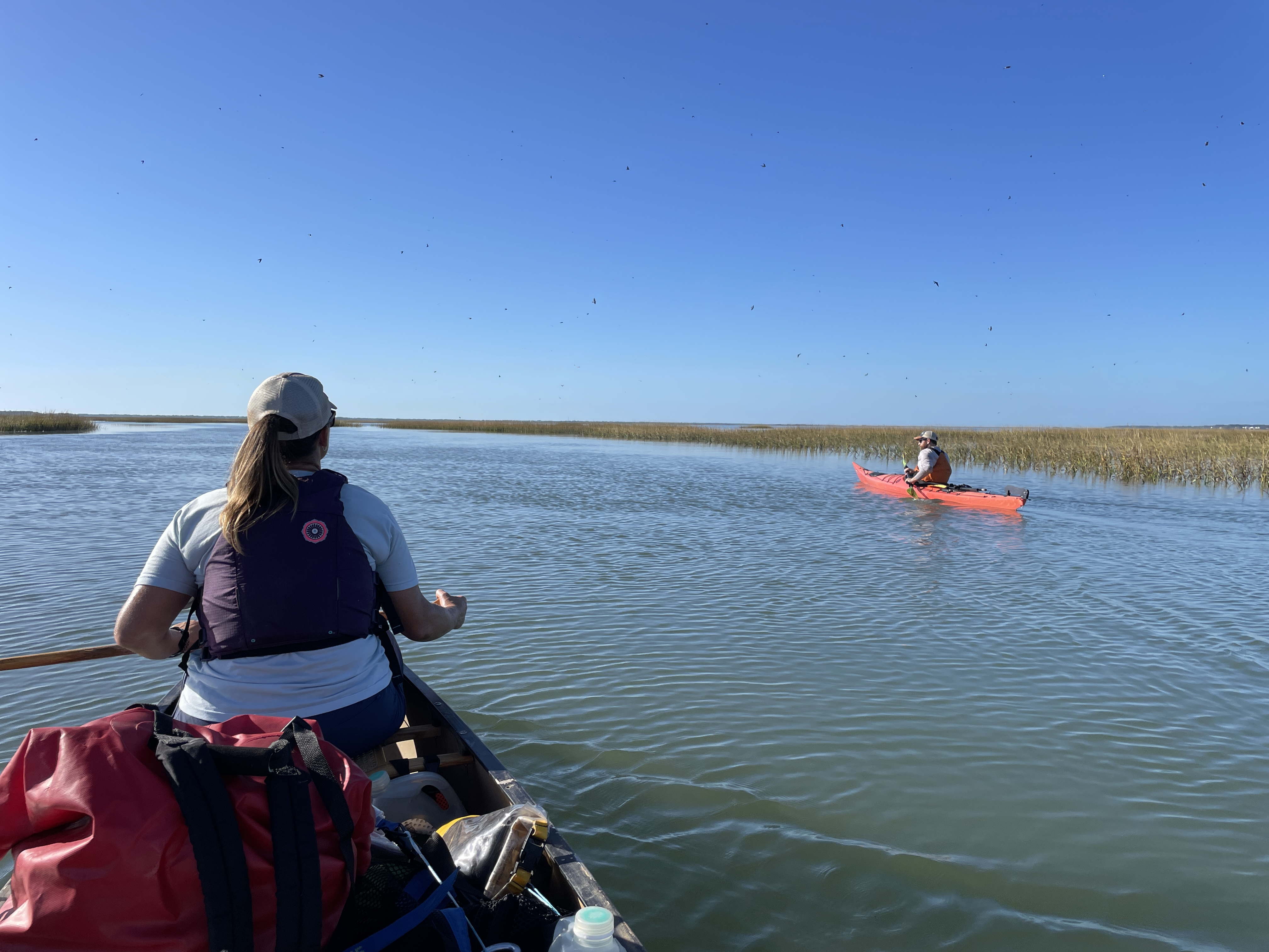 We got into our somewhat free of water boats and started the paddle back to Mount Pleasant. Joey had pointed out a red roof on the shoreline the day before that would be a helpful beacon and we used it to guide us through the maze of marshes and tidal creeks. Just a little ways into our paddle we were treated to another dolphin show, this time it appeared that an entire pod was nearby from the looks of it. We stopped for a bit to watch them, just as mesmerized as we had been yesterday.