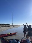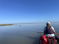 Everything was covered in sand and the mosquitos were still out in full force which made packing less than enjoyable but we got it done. We decided to hand walk our boats to the end of the island to avoid the breakers that were assaulting us as best we could which was still quite the task. The waves were determined to knock us off our feet and swamp our canoe and Joey didn’t have that much of an easier time. When we got around the corner of the island to the calmer channel, we beached the boats to bail them out. Thankfully both Joey and Scott had good bilge pumps and we were able to get enough water out to make them usable again. As we were pumping out the boats we spotted a bald eagle on a telephone pole near us, seemingly gazing down on us and watching what we were doing. A few minutes later another one flew by it and they vocalized to each other. (They don’t sound like TV and the movies make them sound like- they are much more high pitched and whistley. Fun fact- usually the sound you hear them making on TV, commercials, or movies is actually a red-tailed hawk call dubbed over their own calls.)
