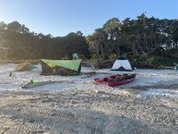We relaxed for the rest of the afternoon, entertaining ourselves with hammocking, dips in the ocean, and strolls down the beach. The mosquitos that we had been warned of appeared about 5 pm and Scott and Joey set up the Nemo Bugout tent that Scott had brought to give us respite from the little vampires who were relentless in their pursuit of our blood. From our safe haven we were able to make our dinners and still enjoy the beach and waves. We made a little campfire outside the tent which in theory helped deter the mosquitos, but in reality I don’t think they were discouraged one bit. Despite the mosquitos we were still able to enjoy the sunset and the changing colors over the ocean and island as the sun retreated were beautiful. After the sunset, we retired to our tents and hammocks, tired but satisfied after a fun day.