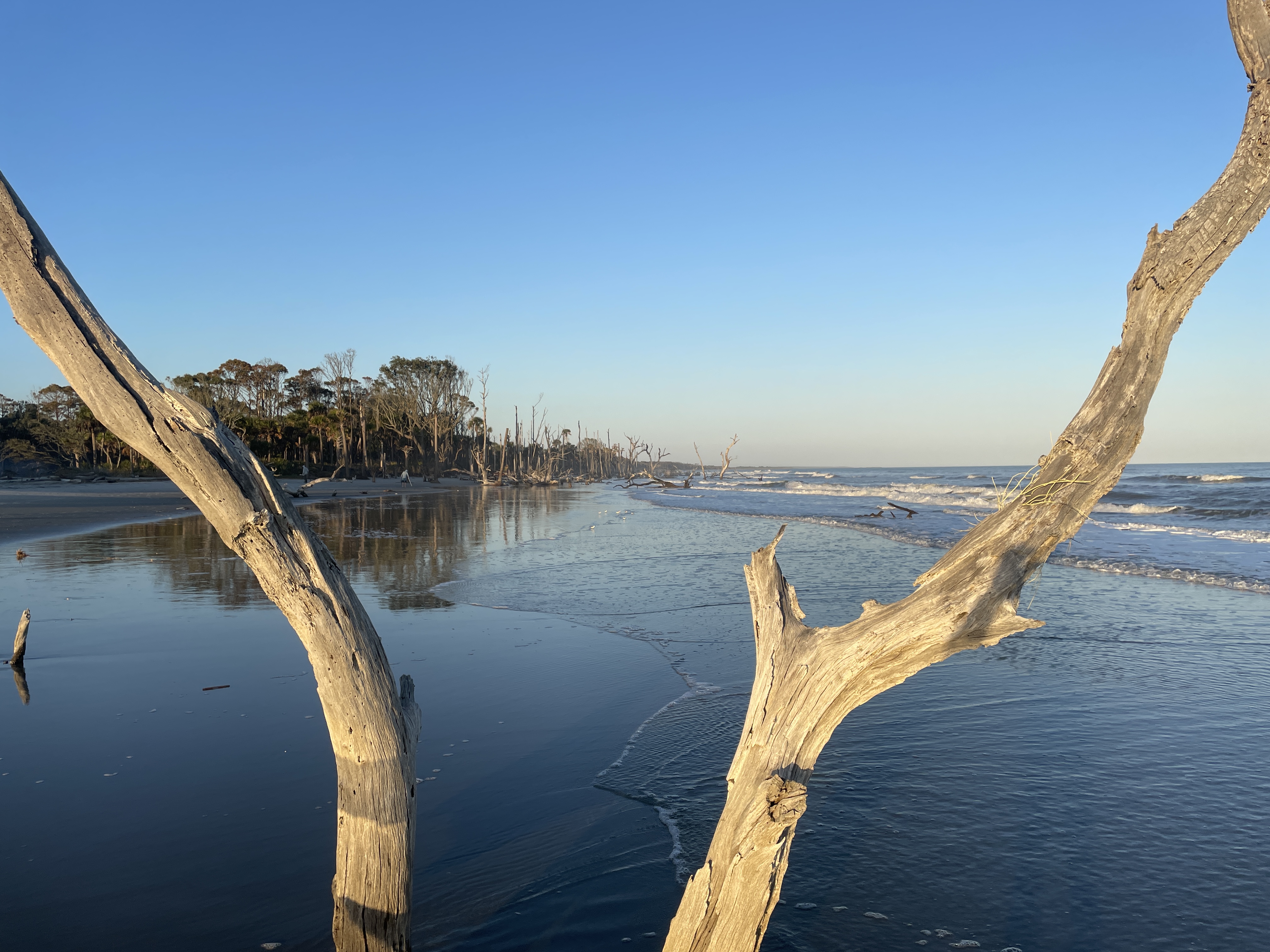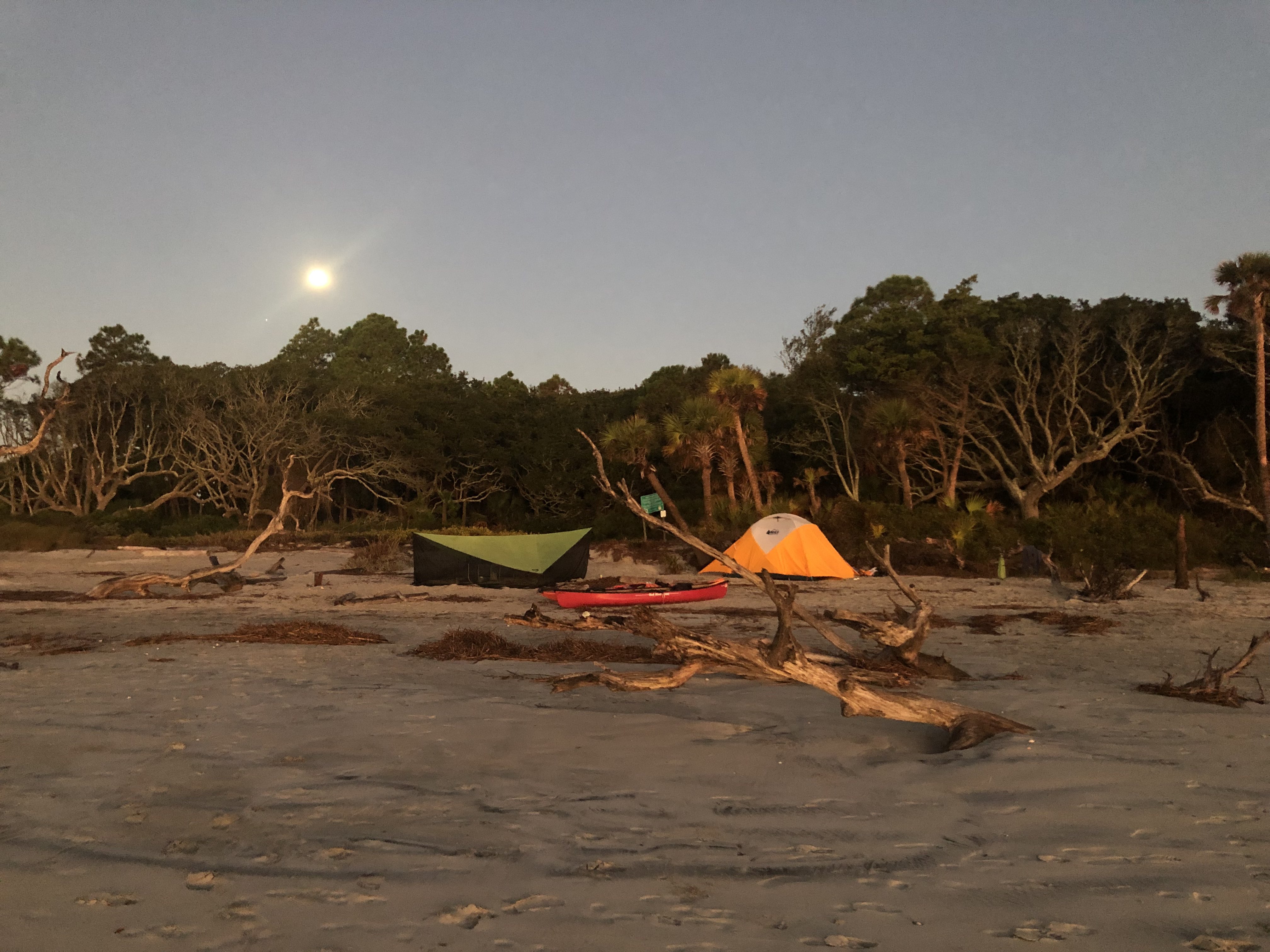 We had been advised by some campers already on the island to avoid the wooded area because the mosquitos were worse there because of the vegetation. Scott and I picked an area that was above the high tide line and not too close to the woods and Joey found some trees a little outside the woods to hang his camping hammock. We did a quick camp setup and then went to check out the “boneyard” beach which is an area of the island where the shore has been eroded away by the tides, winds, and hurricanes and have left dead trees on the shore. Some are still rooted and are in varying degrees of uprightness, and some are driftwood. At high tide the waves crash dramatically into the trees. The overall effect at either tide is a little eerie and looks like an abstract art exhibit.