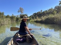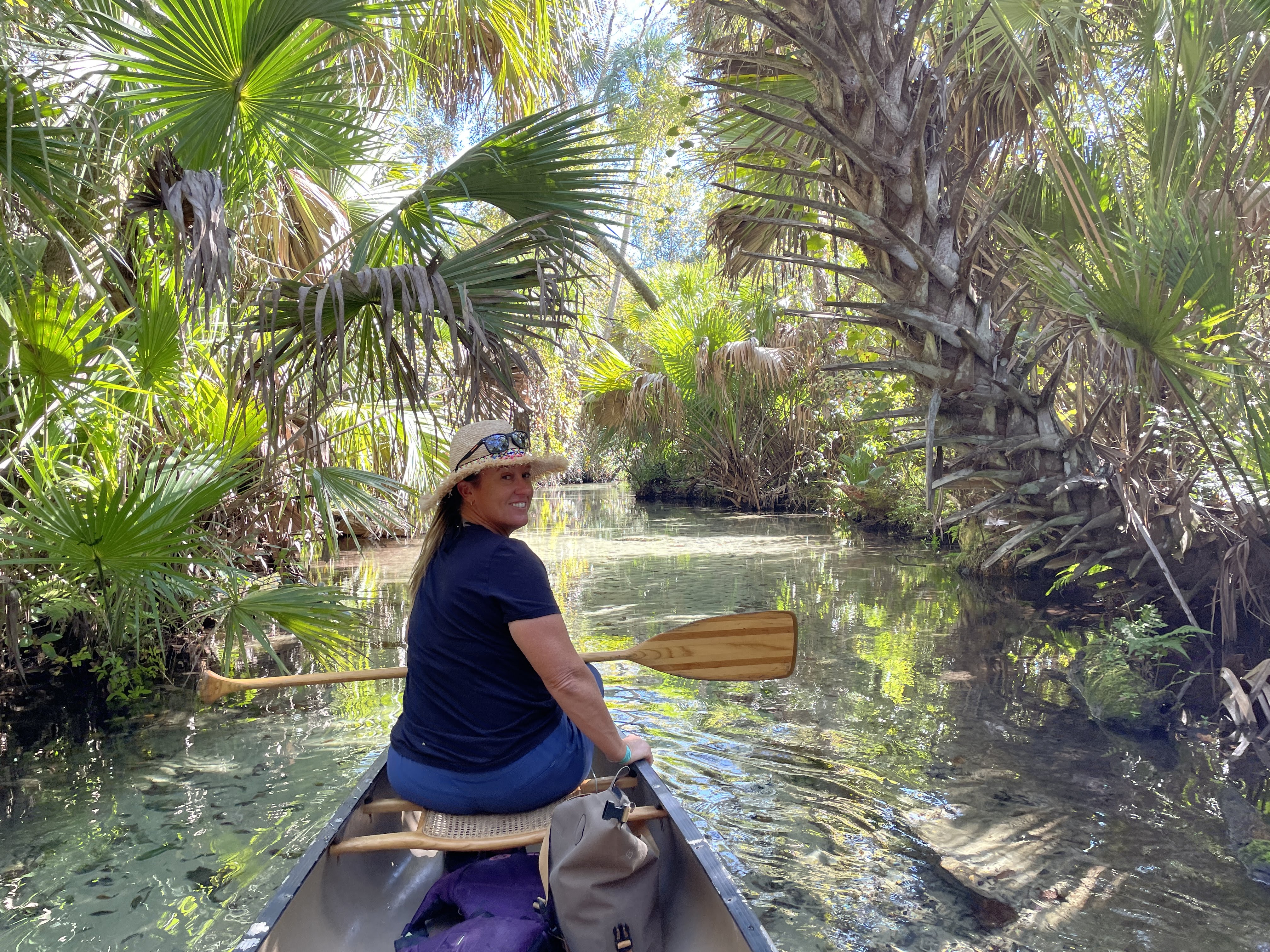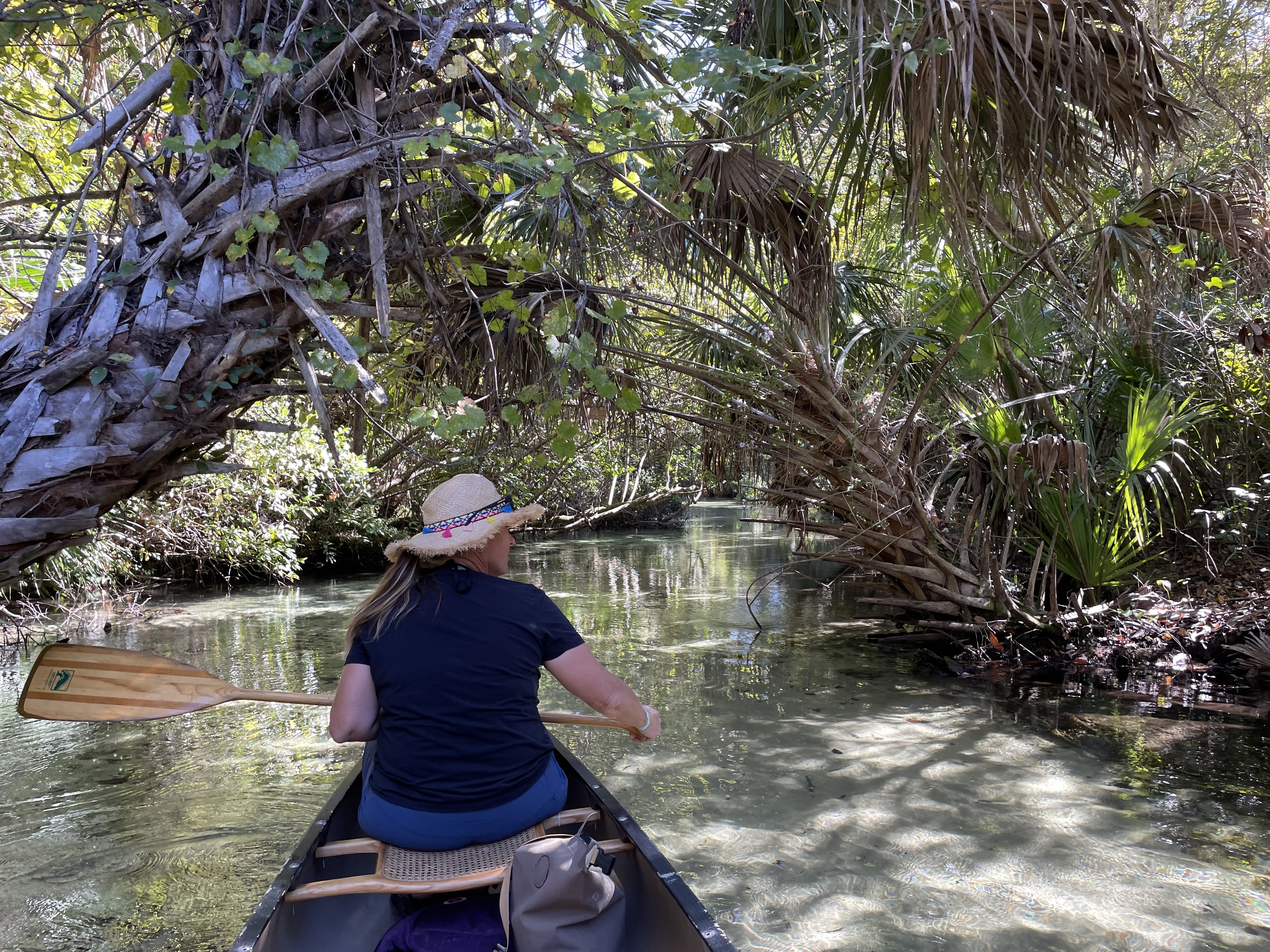 The creek here and the canoe launch made us feel like we were getting into a ride at Disney World. The creek banks were so close that there was just enough room for the canoe to slip between them, the thick subtropical forest made an arching canopy overhead, and the water was impossibly shallow and turquoise colored. It made it feel like we were launching our canoe into the water of It’s a Small World.