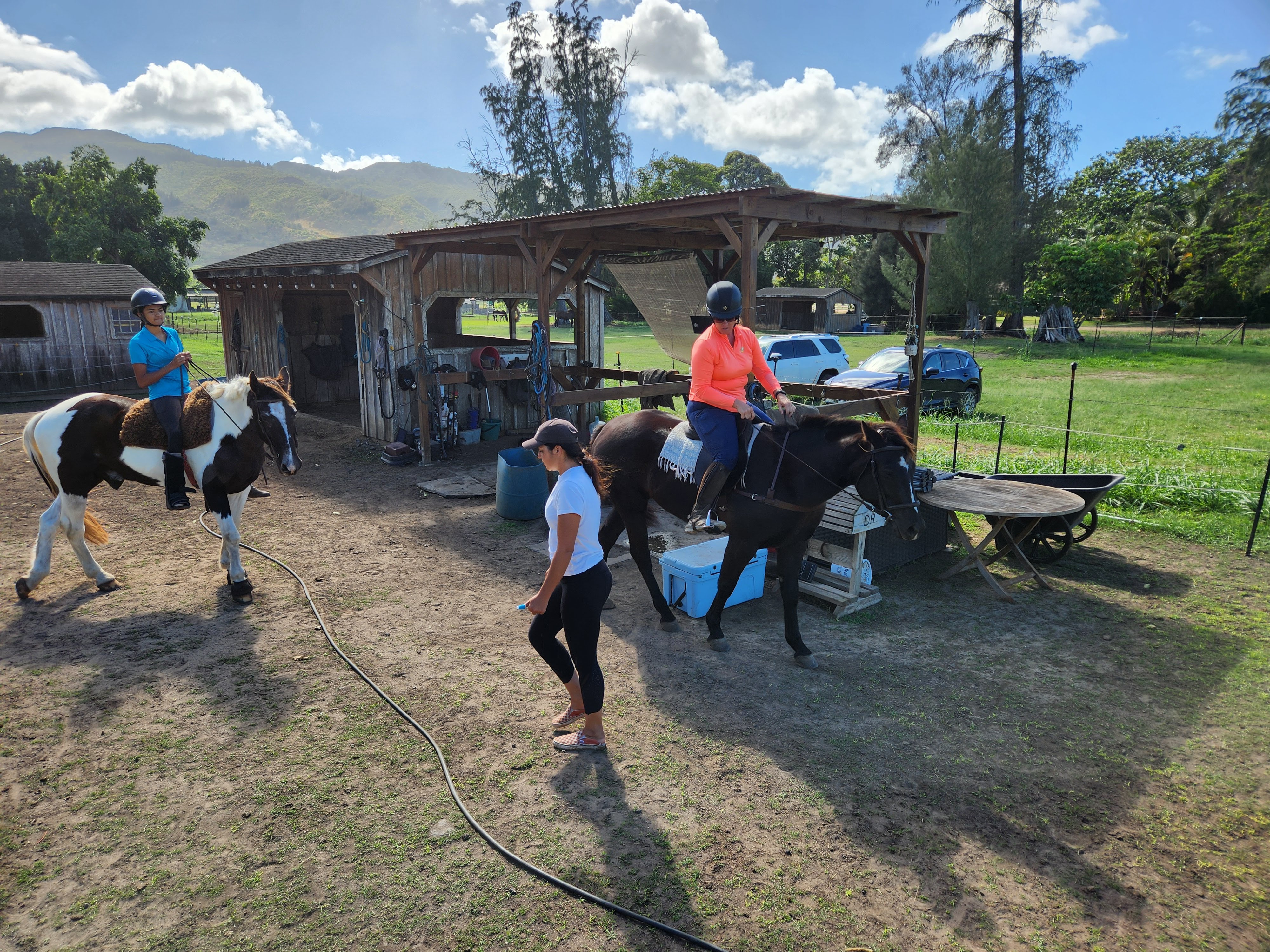 I wrapped up the work day teaching a group lesson at Kawailoa and was thrilled with the quality of riding that I saw. These riders had the classically correct “basic balanced positions” that USPC tries to instill in all its riders and it was exciting to see. Often in geographically remote areas, riders lack access to quality instruction and you see this come through in unbalanced, weak, and incorrect positions. This was absolutely not the case here and it made my job a breeze because I could just give them tools and exercises to layer on skills and further develop their effectiveness, rather than having to fix bad habits. I had a “Pony Club proud” moment during this lesson, pleased that the USPC system and standards were correctly reaching and influencing riders in Polynesia.