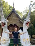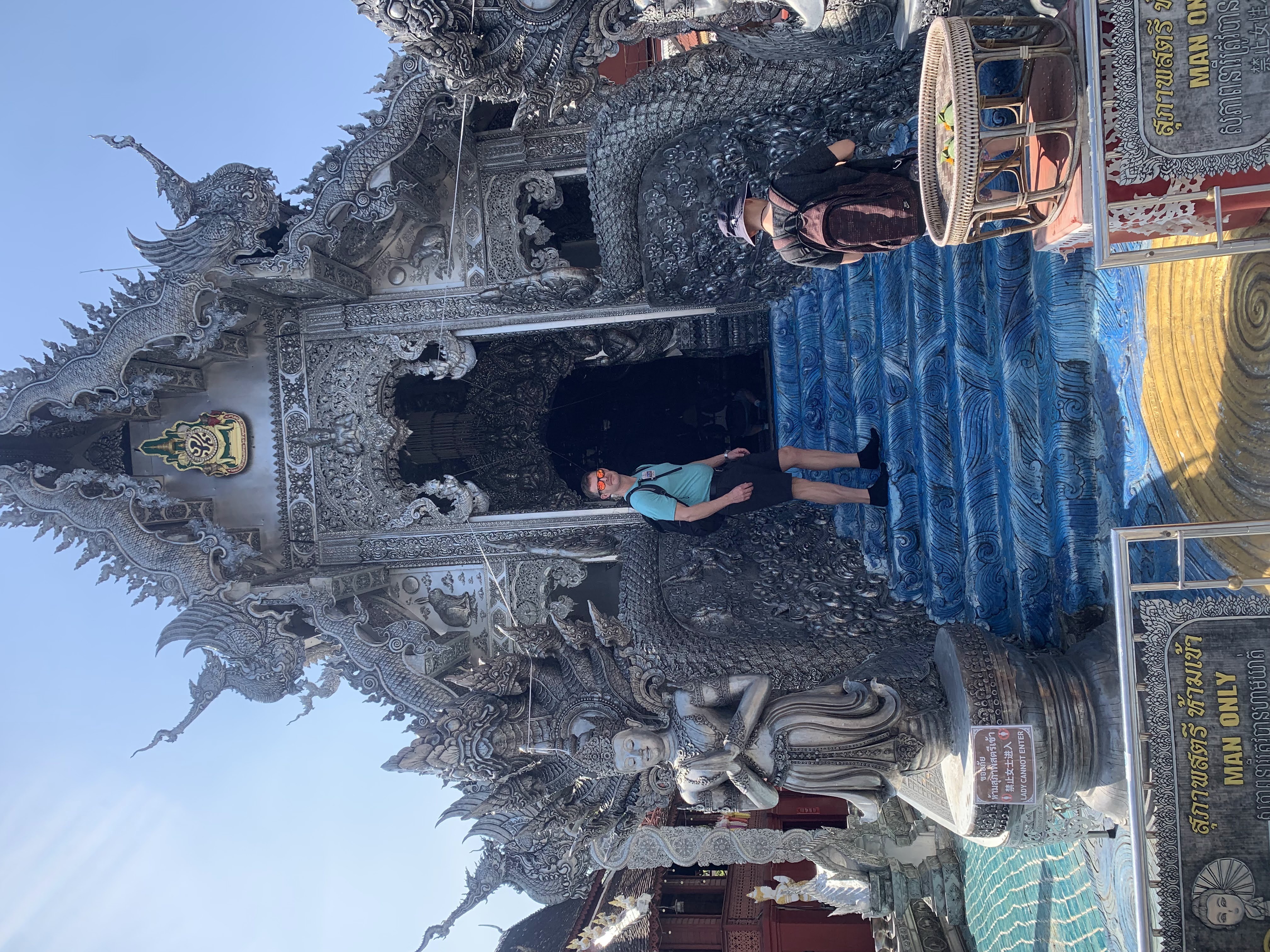 After our new friends were dropped off, Scott and I asked to be taken to the nearby Wat Sri Suphan, or the Silver Temple. We paid our admission, read the placards at the entrance, and then went in. I couldn’t tell you what the inside of the Silver Temple looks like because “SILVER BUILDING ONLY MAN INSIDE WOMAN WALK AROUND AND SEE PICTURE ON MOBILE. ONLY MAN BECAUSE MAN IN THAILAND BECOMES MONK. WOMAN DON’T BECOMES MONK ITS FORBIDDEN. THINK YOU FOR YOUR DONATION AND RESPECTATION.” I didn’t bother looking it up on my mobile and sat outside and took pictures of Scott who was cheekily posing with the “Only Men Inside” signs. (His report: “It looked like all the other wats. There was a buddha and pssst… it wasn’t even silver, it was gold.”)1 We did happen to see a woman trying to go inside the forbidden temple and an apoplectic employee quickly intercept her as he chastened her and explained to her the error of her ways.