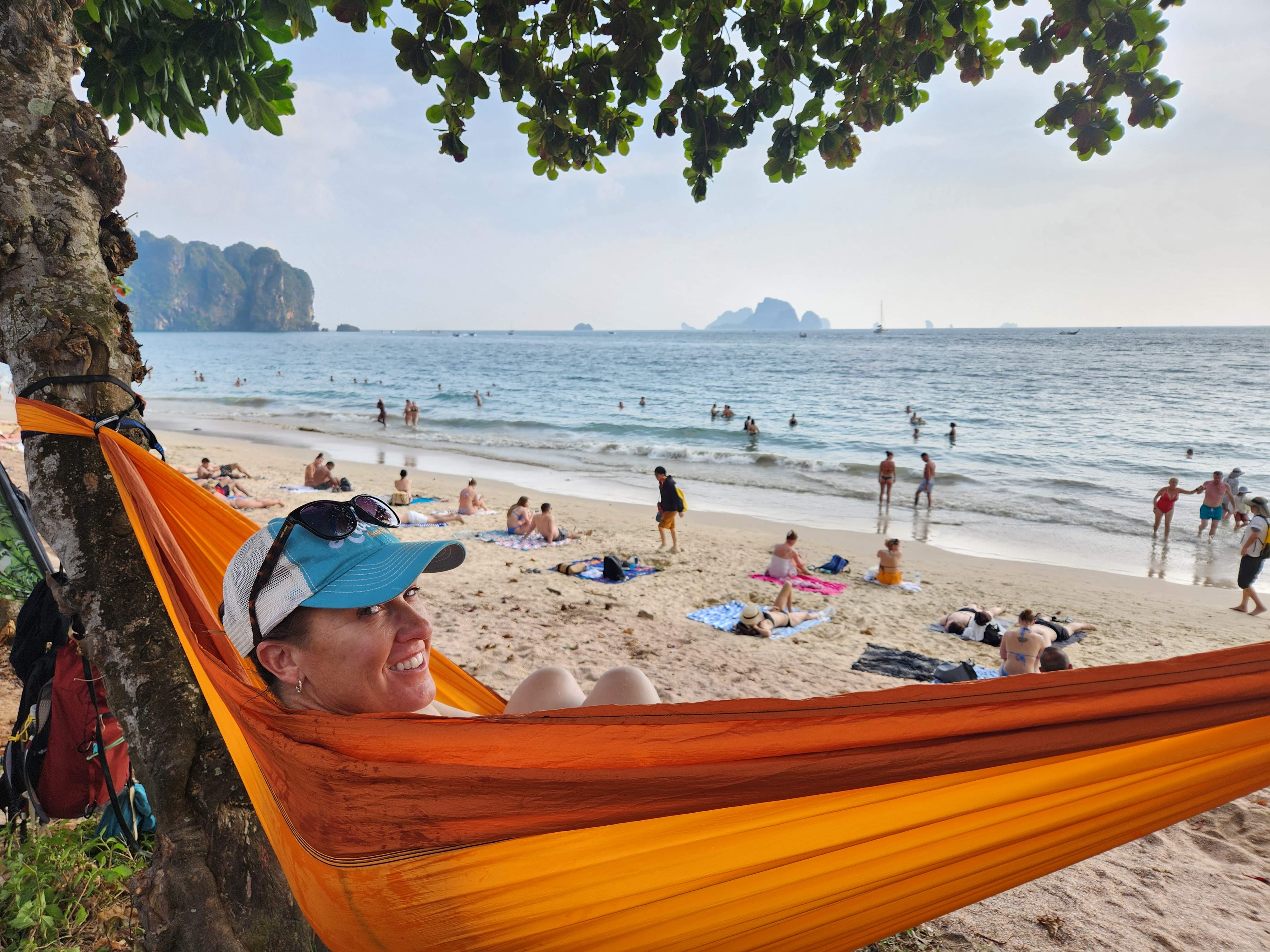 We could hear the beach before we could see, or rather, we could hear the infamous longtail boats whose repurposed automotive engine motors created an obnoxious din as the boats taxied tourists from one island to another. We hung the hammocks in trees near where the beachfront met the road that led to the resorts and we each took turns1 taking a dip in the Andaman Sea.