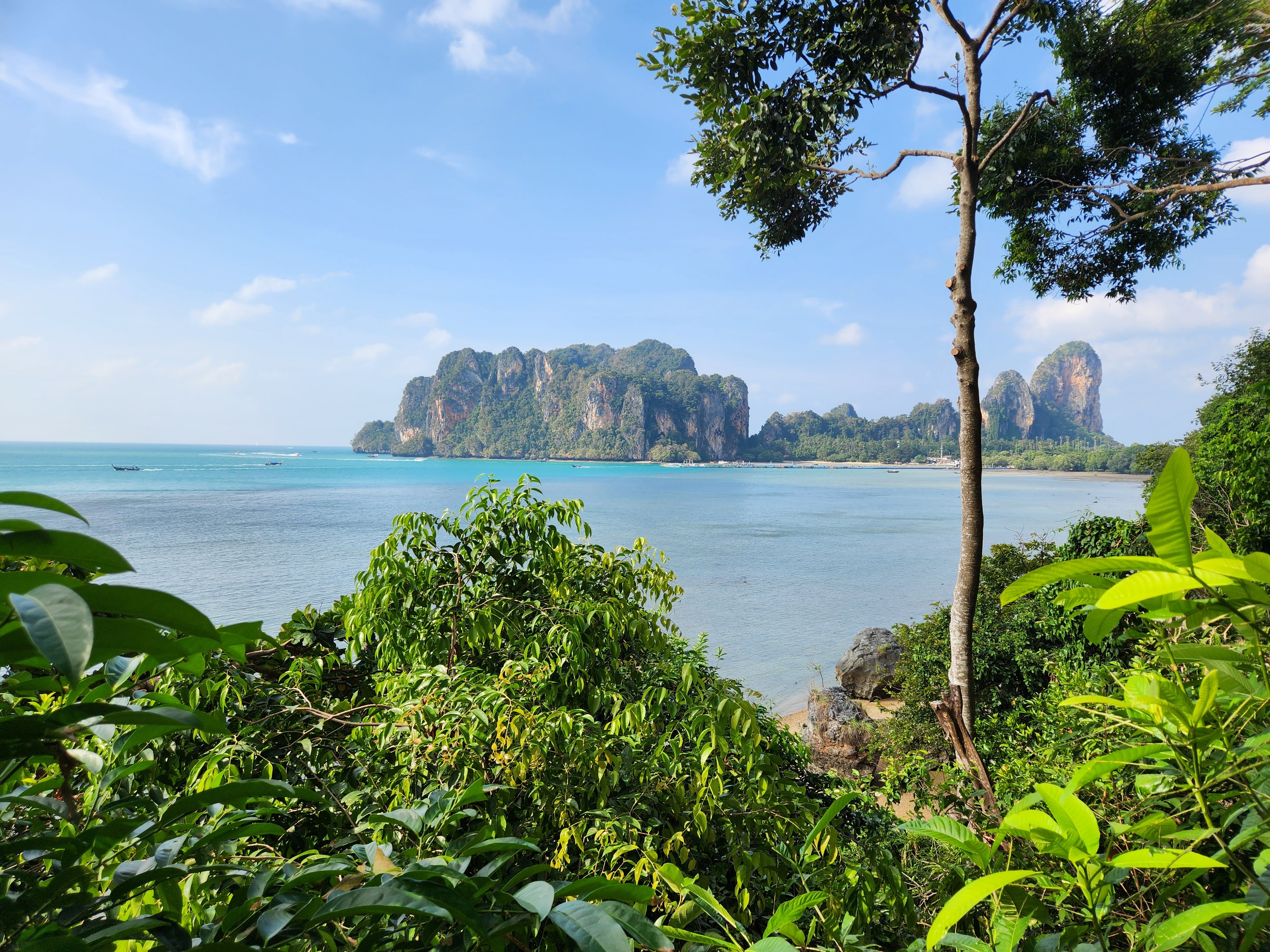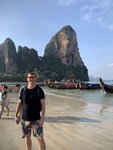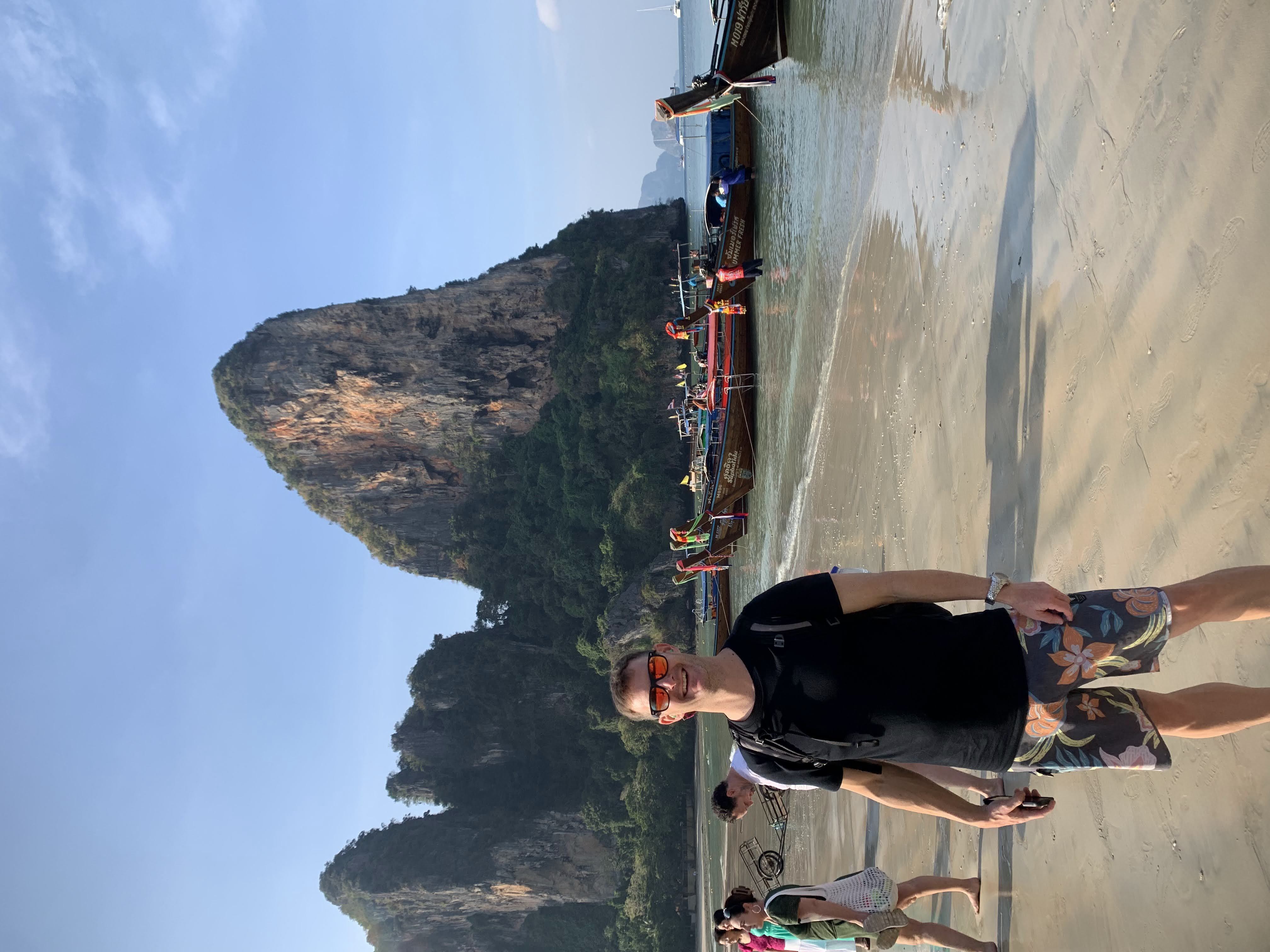 The beach was absolutely packed which made for interesting people watching and the longtail boat traffic was wild. There was a steady stream of them constantly coming and going, and while we had learned from YouTube travel videos that they were prolific in their numbers and in their racket, we didn’t get a true sense of it until we saw it in person. They would pull up onto the beach and throw their anchors at the water’s edge, deposit some passengers who then waded to shore, wait a few minutes, then load their next haul of passengers and take off across the horizon to some other place- most likely Railay Beach which was close by.