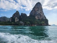 By the time we finally reached Phra Nang Cave and beach, it was pretty crowded. Luckily there was not as much boat traffic on this side of the peninsula so it was much quieter. We took a brief peak into the cave to see all of the, um, unique offerings that had been left in it, took the requisite pictures, and then ventured off in search of a good place to hang our hammocks along the beach. We had to take turns swimming again since this beach was a prime spot to have your stuff stolen. The water was a clear turquoise and was stunning. There was a sandbar that you could wade waist deep along that led you to one of the huge karsts that had its own sandy beach. We spent several hours enjoying the beach, thoroughly soaking in both the sun and the surreal scenery, before deciding to eat a bite for lunch overlooking the bay, and then catch a longtail boat back to Ao Nang.