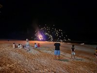 We headed back to our hotel for a shower before venturing back into town for dinner at a spot near the beach. (We walked so much this day- it was our record for most steps taken during the whole trip at almost 25,000!) On our way to the restaurant we booked a catamaran trip for the next day at a kiosk in town. We then enjoyed a sit-down dinner and after, picked up some cold Chang beers3 to sip while sitting on the beach while we were waiting for the fire show that was hosted by a local beach club to start. While waiting we actually saw that another fire show was happening further down the beach so we strolled down to watch and were suitably impressed. When that one finished we headed back up the beach and we got front row seats on the lawn and were thankful that we had, because what a show it was! These guys were unbelievable and took their fire show to the next level compared to the warmup act that we had watched a few minutes before. I even got to hold one of the props while one of the performers held the other end of the spinning ring of fire. When it ended we made the 1.5 km trek back uphill to our hotel, exhausted from all the walking but also from all the fun that we’d had exploring Ao Nang and Railay.