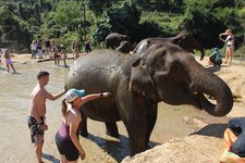 As soon as the treat balls were gone the elephants marched down to the river with the mahouts and with us trailing along. We were given bowls to splash the elephants and were told to be careful if they laid down in the river, not to get entangled with their legs, or else we would get squished when they went to stand up. Some got into the river and immediately dropped down to wet their bodies and others stayed standing. Water was flying everywhere as the group went about the business of dousing the elephants. When they were thoroughly wet, a group picture and water fight (with just humans) ensued as the mahouts guided the herd out of the river and up to the giant mud puddle for their mud bath.