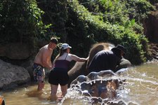 The leaders then told us to head back up to the pavilion so that we could do the next activity. We then gathered round a table and were shown how to make vitamin and mineral enriched elephant treats to supplement their diet. We took turns mashing up the pellets, tamarind beans, and bananas with a huge wooden mortar and pestle, balling up the resulting mash, and then wrapping the mash balls with banana peels. We were then sent to change into our bathing suits.