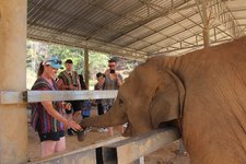 Scott and I, along with some other participants, helped carry the tubs of fruit and vegetables down to the elephant shed where the herd was anxiously waiting to be fed. The elephants were standing somewhat patiently on their side of the post railing and we were allowed to hand feed them pieces of watermelon and squash. Some of them took it with their “finger” at the end of their trunk, while others would wrap their entire trunk around the slice to take it. They definitely had individual preferences.