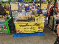 Our walk to the park took us through the beautiful Chulalongkorn University campus, or Chula University as it is more commonly known. The largest university in Thailand, its campus reminded us of a stateside school with its tree lined walkways, carefully tended gardens and lots of student activity. It hosts a medical school and we are hypothesizing that it’s because of this that the on campus outdoor food market that we visited gave the most nods to food handling safety that we had witnessed to date in Thailand. There might not have been any plastic gloves or hand washing going on but the vendors had erected a very crude sneeze-guard with saran wrap so there is that. Since this was our last day in Thailand we went a little crazy on buying Thai foods to try and got a little bit of this and a little bit of that from several stalls (all for just a few US dollars) to supply our picnic. I was hoping for some roti but unfortunately didn’t find any.