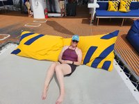 The catamaran was just as luxurious as the promotional materials had promised and we were escorted to our assigned seats that were perfect for lounging and soaking up the sun (or shade if you got too hot) and given a welcome drink. The cushions and pillows and color scheme added a level of poshness and made for lovely photos… especially with the dramatic limestone karsts of the Andaman Sea in the background. We settled in before going to check out the rest of the boat. It had an upstairs that was similar to our deck and the front lounging area had several types of comfy seating in addition to its “trampolines,” and even had bean bags that could be taken onto them.