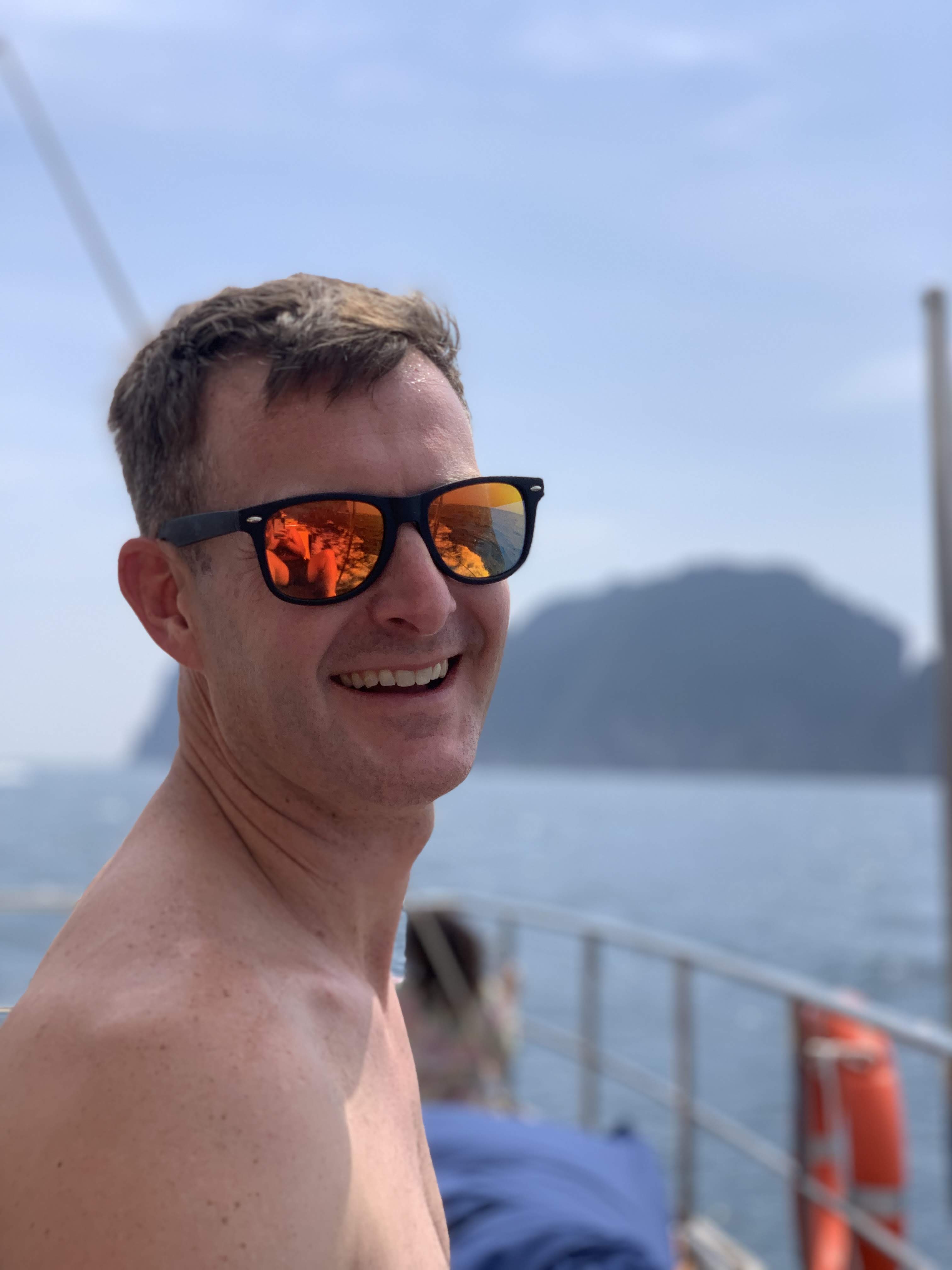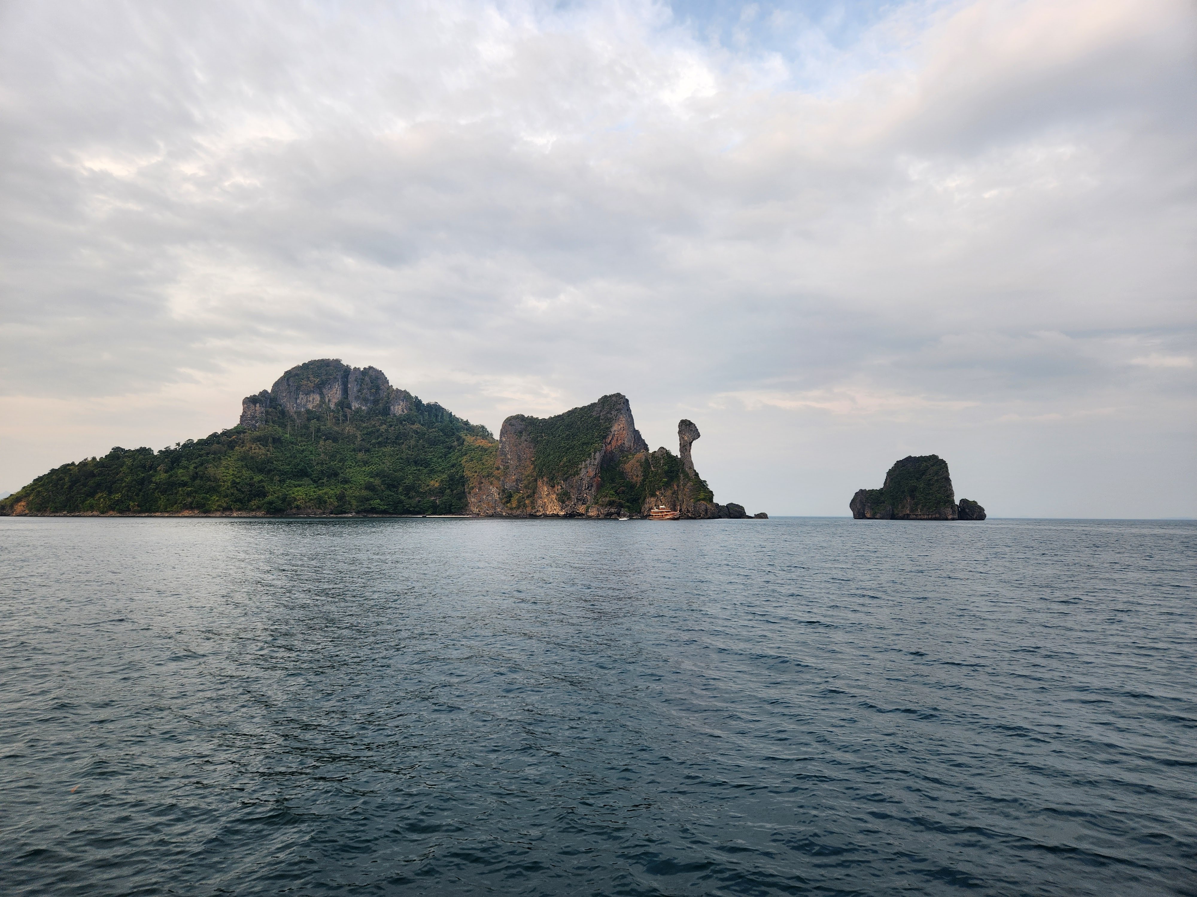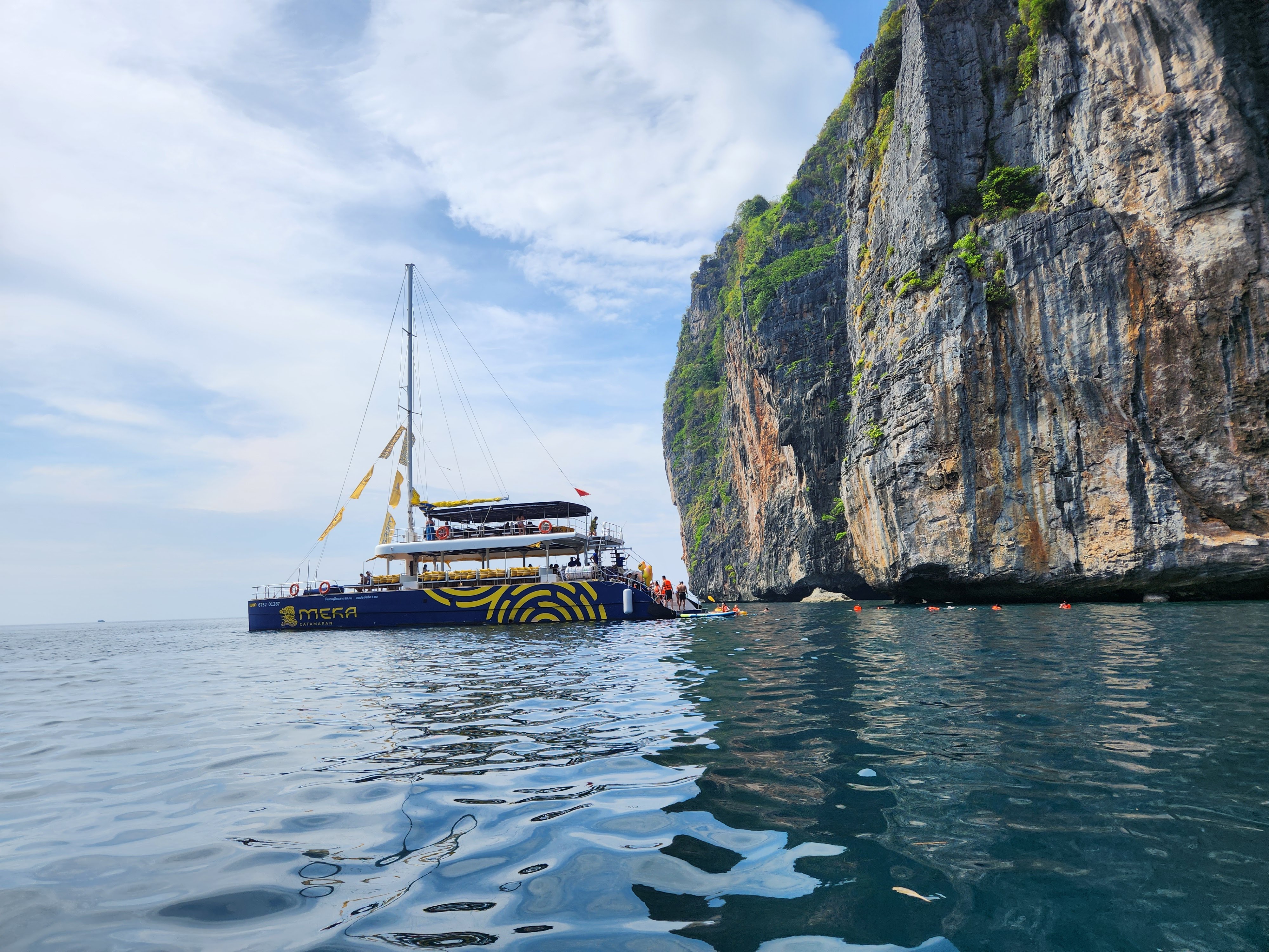 Lunch was served and we both enjoyed the offerings, and soon after we were at Koh Phi Phi Leh, home to Maya Bay. The catamaran dropped its anchor in the deep water and we were allowed to swim, snorkel, or paddle around. The limestone karsts rose up around us like highrise buildings which was impressive. The iconic half of Maya Bay was roped off to prevent traffic (boat and human) from getting too close to the beach, as its popularity due to the movie The Beach, had caused over tourism and the health of the reefs, water, fish, and entire bay had suffered. A revitalization project had been started in 2018 which actually closed off the area entirely to tourists while the area could be nursed back to health, and it was eventually reopened in 2022 with much stricter rules and regulations about its access in place.2