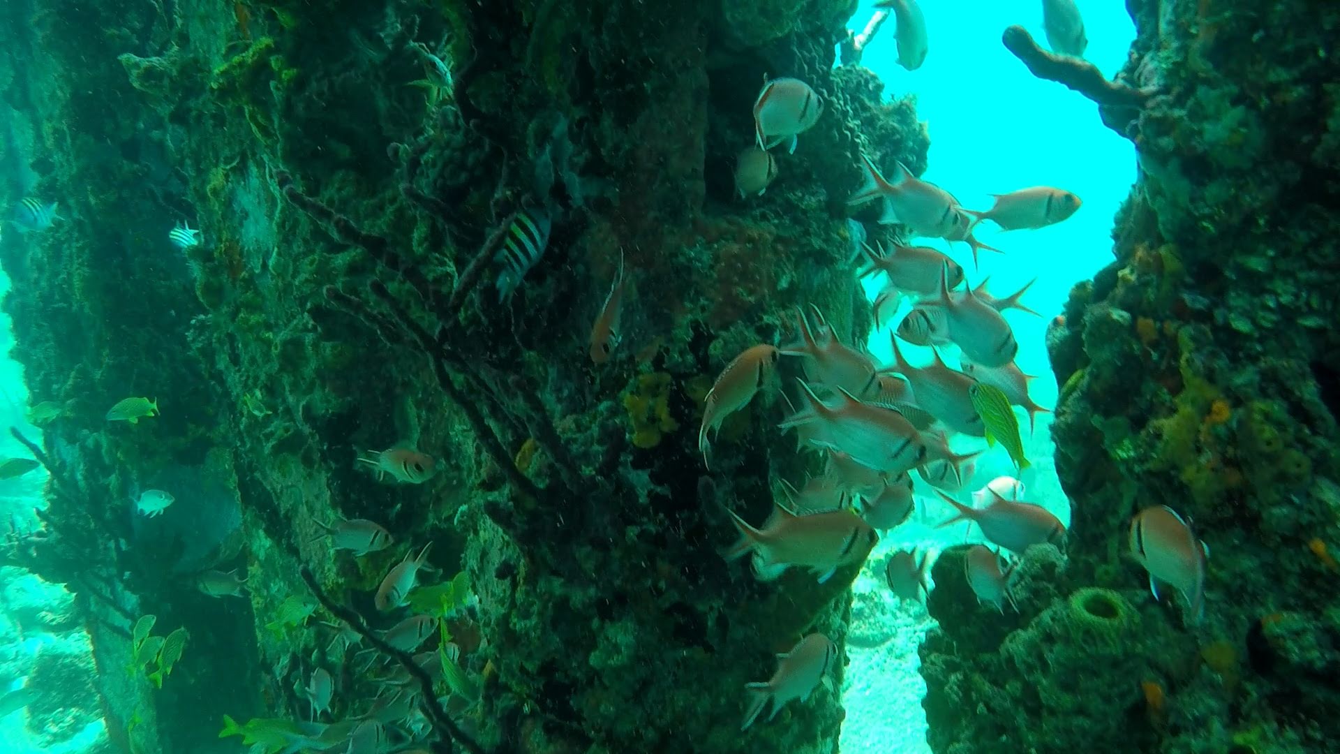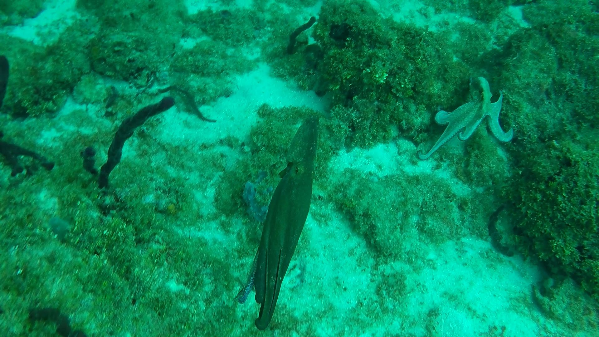 While I was teaching the morning sessions he went on his last dive at the Fredriksted cruise pier and it turned out to be his best and favorite one of the week. He was out for a little over an hour and came across a puffer fish and a little sea turtle that was perched atop some coral on one of the pier piles sleeping. His most exciting discovery of the dive was a trio of octopuses and he was able to watch them for a few moments, fascinated by their ability to change their color on demand to correspond with their surroundings as they glided around the seafloor.