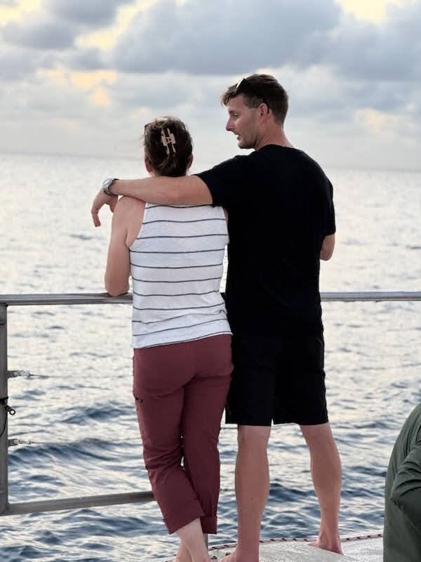 Where were we? Oh yes, the sunset cruise. We enjoyed getting front row seats and chatted with the family behind us- a group of siblings that had met up in STX from around the entire US. The rum punch started flowing1, and as always once I start drinking, I start telling Scott all the reasons he should marry me. And as this always goes, he tells me all the reasons we shouldn’t get married. It was during this passionate “Request for Proposal phase of the evening” (that’s what Scott calls this) as we were standing along the boat’s railings looking out over the dramatic colorscape that the sunset offered up that evening, that the siblings we had met took the VERY BEST photographs of us that I have ever seen. We had no idea that they’d taken them and when we eventually sat back down they said “I hope you don’t mind but we wanted to snap some pictures of you guys because it looked like you were enjoying yourselves so much.” We thanked them profusely and assured them there was nothing weird at all about them having done so and they shared the photos with us. I am so thankful of their kind gesture because it captured candid snapshots of an incredible evening for us and the shots so perfectly capture and sum up our relationship.