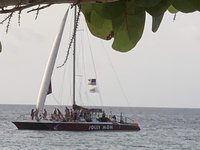 We arrived at the Fredriksted pier early and killed time by sitting in the shade and reading until it was time to board. We were given the standard catamaran trip briefing but also a little history on the 63 foot vessel we would be sailing on. Though she now sports the name The Jolly Mon, the boat has a storied past and used to be named Che Cje. In her previous life she was the fastest catamaran of the 1970’s, setting several transatlantic racing records. She was then purchased by an enterprising businessman drug czar who took advantage of her sleek engineering and speed and used her for drug running in south Florida throughout the Don Johnson/Hawaiian shirt/Miami Vice era until being intercepted by the US government in the 90’s. She was auctioned off and now in her golden years, finds herself giving leisurely sails through the Frederiksted harbor several times a week to tourists, set to the gentle beats of live easy-listening Reggae, never having to look nervously over her shoulder to see if the Coast Guard or DEA are in hot pursuit.