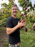 The next step was to put the nibs in a hand-cranked grinder and Scott was shown how to grind them down. The powder was collected in a banana leaf and was then processed through the grinder two more times. At this point it was ready to either be briefly frozen so that it formed a patty of sorts, or could be added to hot milk with some cinnamon to make Ecuadorian hot chocolate. Half of the powder was put in the freezer on the banana leaf, and Carlos took the other half to make the hot drink for us. He had snapped a twig off a cinnamon tree in the orchard and then used a knife to scrape off some of the bark into the saucepan as he stirred the cocoa powder into the hot milk.