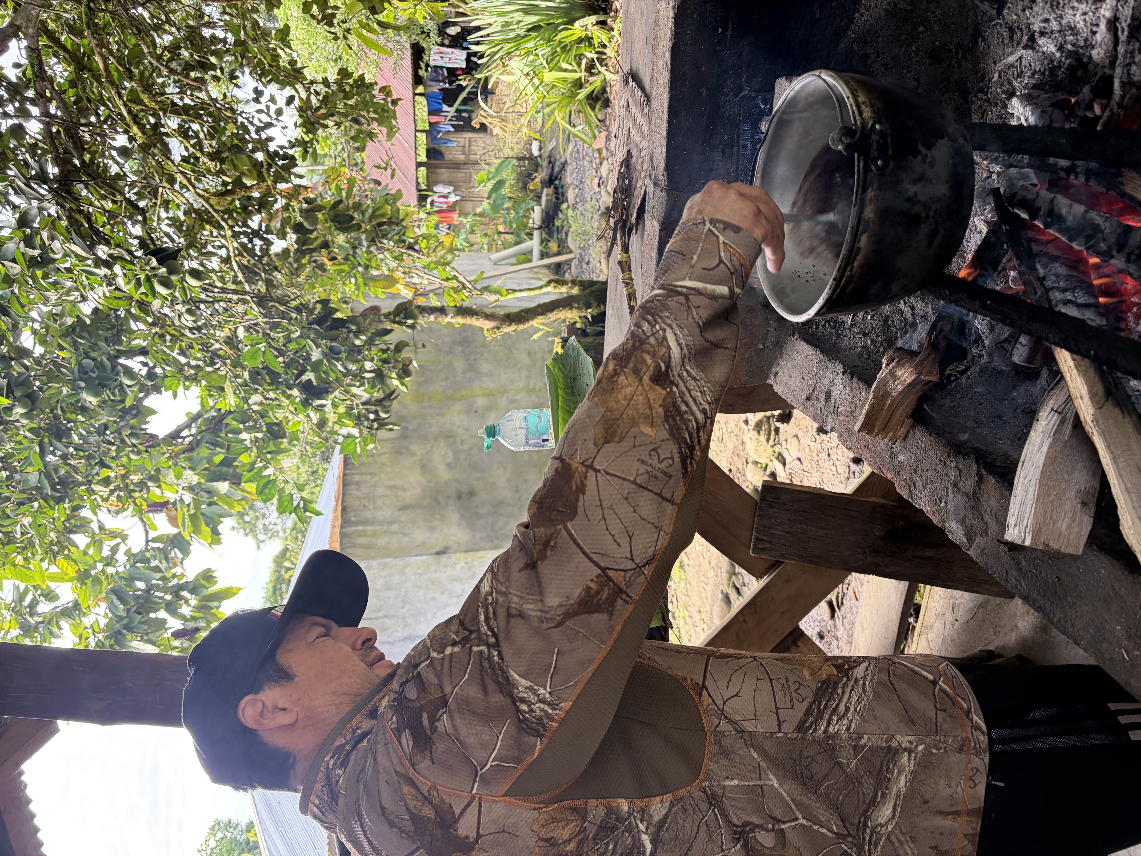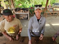 Carlos walked us over to a fire on a stove that was being tended by the orchard owner. The orchard owner handed Scott a wooden spoon and instructed him to stir the cacao beans around the pan. Once roasted, they were removed from the heat, and we were then shown how to crack them and remove their outer covering and to save the interior portion. At this point they closely resembled, as well as smelled like, coffee beans. At this stage these were considered “cacao nibs.” We were told to sample them and I already knew I would not be a fan since I am not a huge chocolate lover and certainly do not appreciate dark or bitter chocolate.