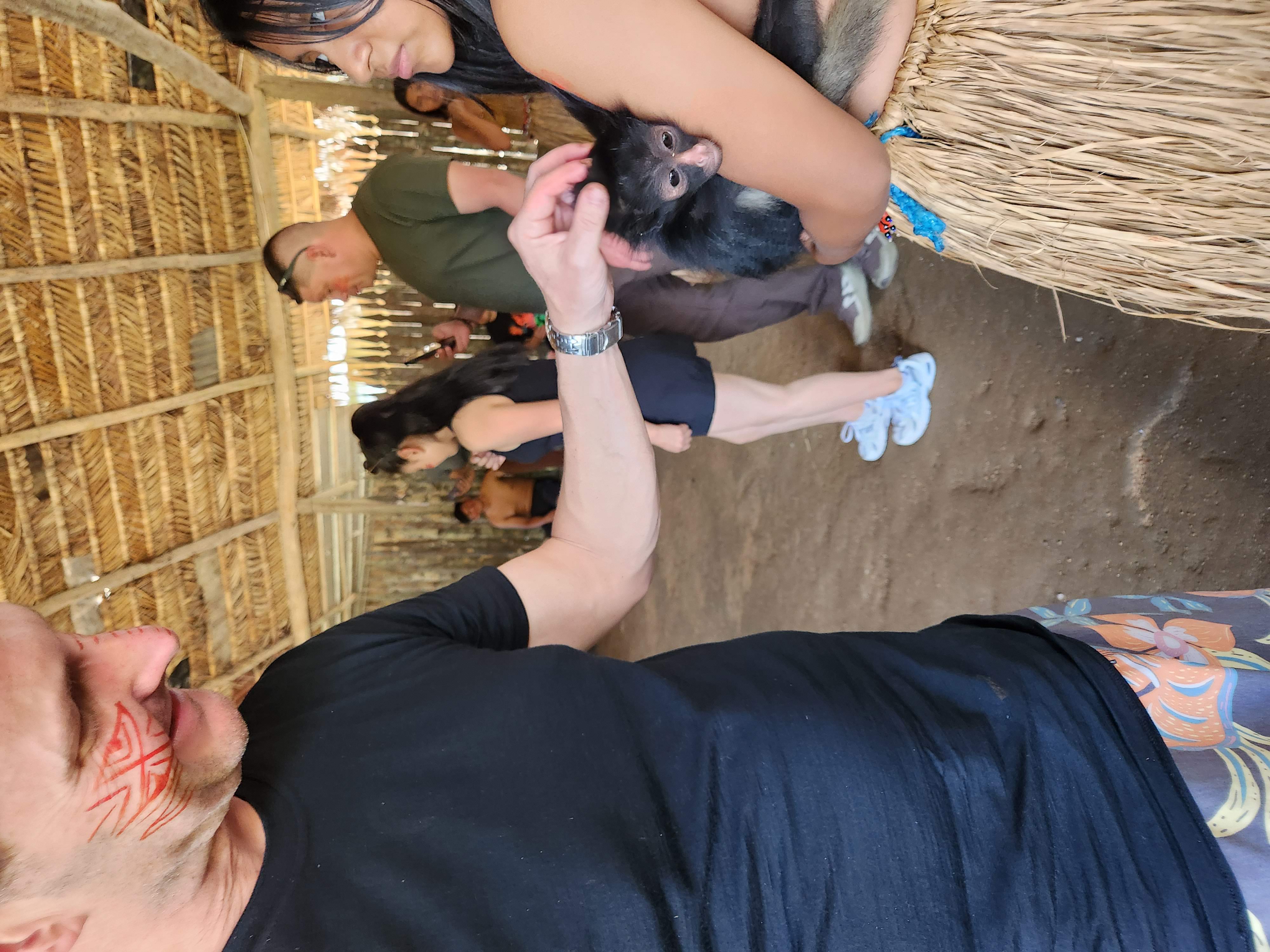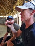 We declined the offer to eat the fat, wriggling and writhing chontacuro grubs that were offered to us next, but did partake in the traditional face painting. Evidently Scott’s pattern was meant to protect him if he were to head off into battle and I missed hearing what my pattern meant. We were offered the chance to hold a macaw and a monkey (Scott pet the monkey which made me mad because I object to them being bred for pets and I warned him that they bite, and if bitten he would have to have post-Rabies exposure treatment but he did it anyways) and then got hustled for donations and then were sent to the gift shop. I did buy a cute beaded bracelet.