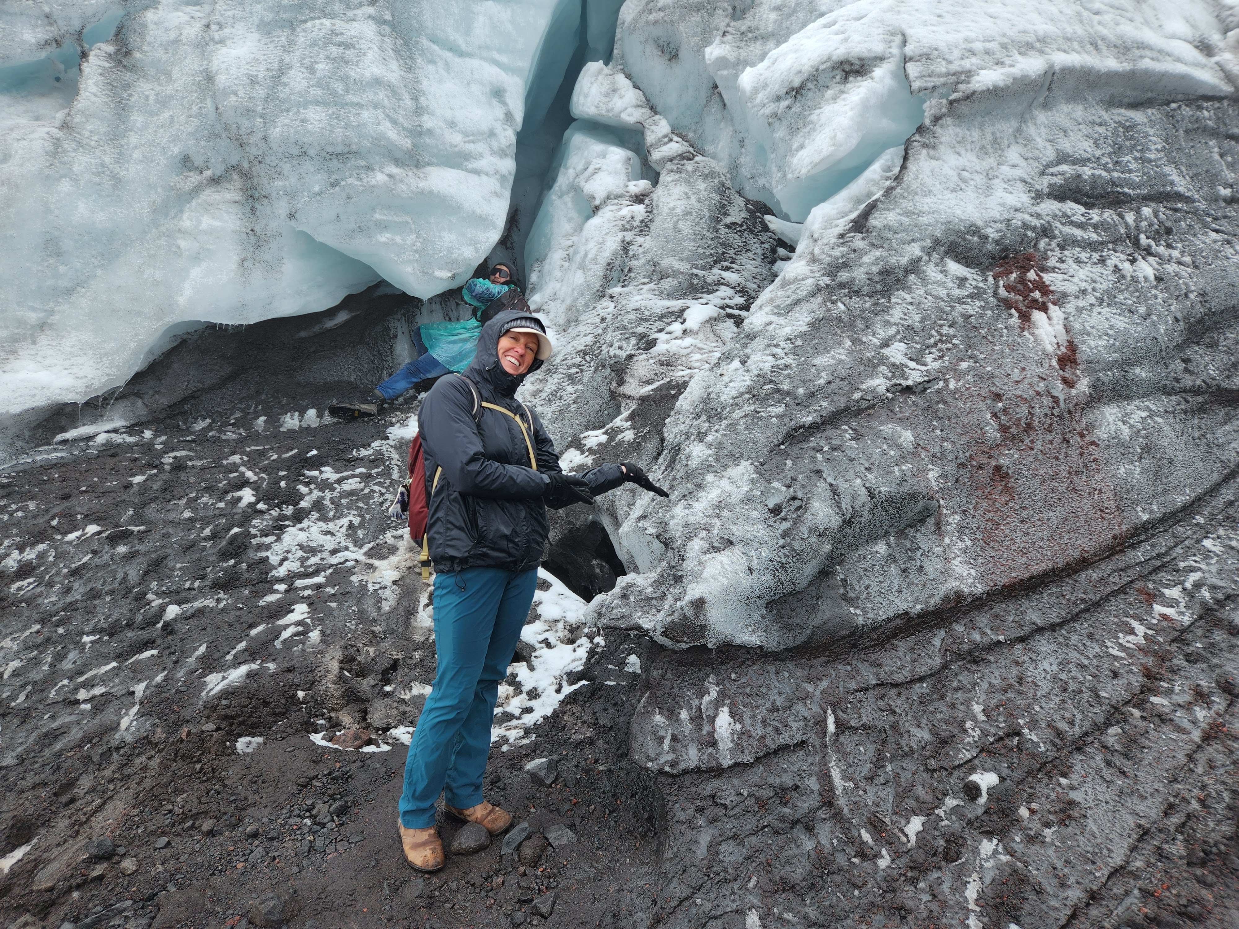 The base camp to glacier leg was pretty intense because the footing changed. It was more hard- packed but with loose rocks over top that caused your feet to slide out unexpectedly from underneath you. There also was a little bit of rock scrambling that we had to do. I also learned something. I knew that mountain climbers strike out early on their hikes, and I never really thought about why that was until I got to experience it firsthand on this hike. It is because the sun’s light causes glacier melt and causes little streams and creeks to appear so the going gets sloppier and potentially more dangerous as the day goes on. (It also makes snow bridges more likely to collapse as the day gets warmer, although that didn’t apply to us.)